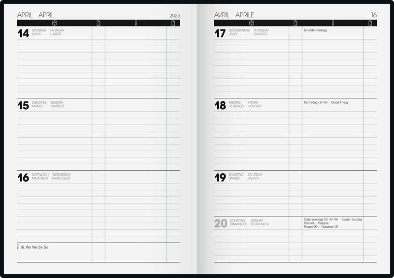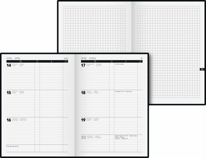 Blattgröße: 148 × 208 mm 2 Seiten = 1 Woche 352 Seiten, Druckfarbe Kalendarium: schwarz 80 g/m², Klebebindung viersprachig: deutsch, englisch, französisch, italienisch Kunststoff-Einband Baladek, Farbe: schwarz Jahresübersicht aktuelles Jahr, 4 Seiten Monatsplan aktuelles Jahr, 4 Seiten Folgejahr, Ferientermine Deutschland, Österreich, Südtirol, Frankreich, Luxemburg und Schweiz, 208 Seiten Notizen kariert mit Seitenzahlen, 16 Seiten Adressen 2 Zeichenbänder für Kalenderjahr 2026