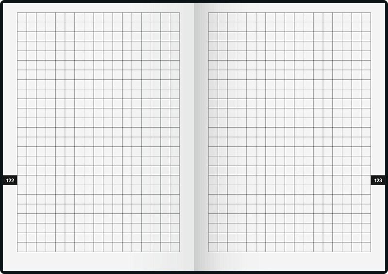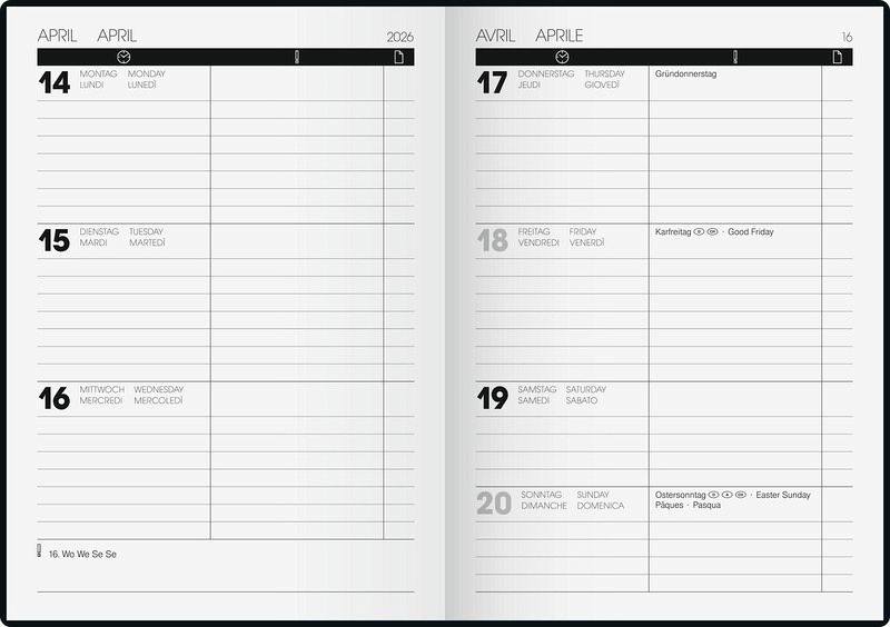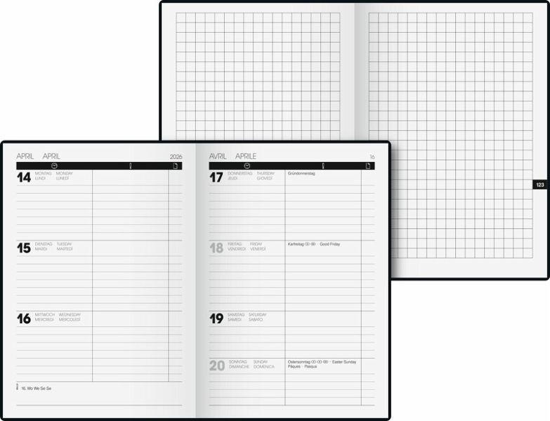 Blattgröße: 100 × 140 mm ? 2 Seiten = 1 Woche ? 352 Seiten, Druckfarbe Kalendarium: schwarz ? 70 g/m², Klebebindung ? viersprachig: deutsch, englisch, französisch, italienisch ? Kunststoff-Einband, Farbe: schwarz ? Jahresübersicht aktuelles Jahr und Folgejahr, 12 Seiten Monatsplan aktuelles Jahr und Folgejahr, 208 Seiten Notizen kariert mit Seitenzahlen, 16 Seiten Adressen ? 2 Zeichenbänder ? für Kalenderjahr 2026