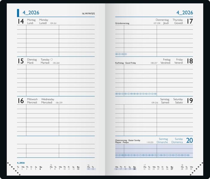 Blattgröße: 87 × 153 mm ? 2 Seiten = 1 Woche ? 144 Seiten, Druckfarbe Kalendarium: schwarz/blau ? 70 g/m², Klebebindung ? viersprachig: deutsch, englisch, französisch, italienisch ? Grafik-Einband, Farbe: bunt ? Jahresübersicht aktuelles Jahr und Folgejahr, 12 Seiten Monatsplan aktuelles Jahr und Folgejahr, Ferientermine Deutschland, Österreich und Schweiz ? für Kalenderjahr 2026