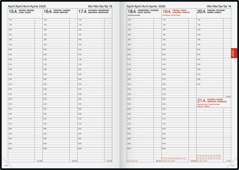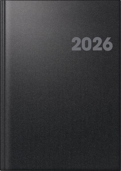 Blattgröße: 210 × 290 mm 2 Seiten = 1 Woche 144 Seiten, Druckfarbe Kalendarium: schwarz/rot 90 g/m², Fadenheftung viersprachig: deutsch, englisch, französisch, italienisch Kunststoff-Einband Metallico, Farbe: vulkanschwarz Jahresübersicht Vorjahr, aktuelles Jahr und Folgejahr, 4 Seiten Monatsplan aktuelles Jahr, 4 Seiten Folgejahr, Ferientermine Deutschland, Österreich, Südtirol, Frankreich, Schweiz, Belgien und Luxemburg, 17 Seiten Notizen liniert viertelstündliche Einteilung von 7-20 Uhr, Sa. 7-13.30 Uhr, So. ohne Stundeneinteilung Eckperforation, 2 Zeichenbänder für Kalenderjahr 2026