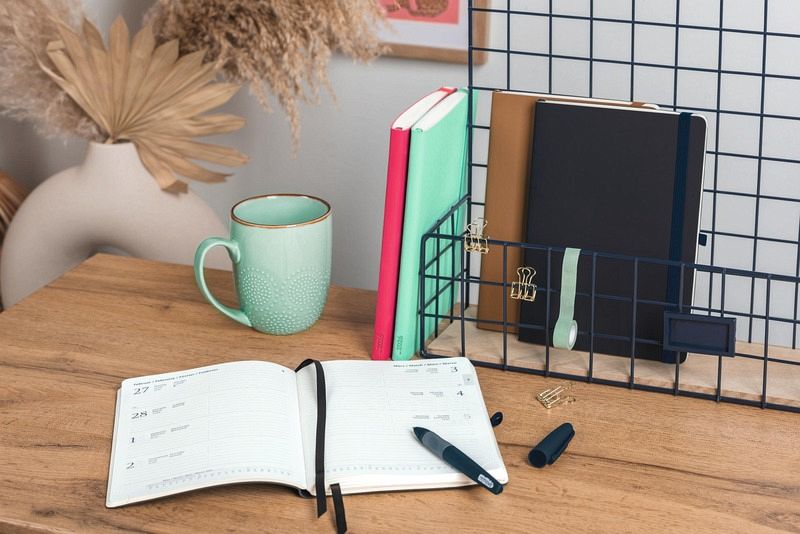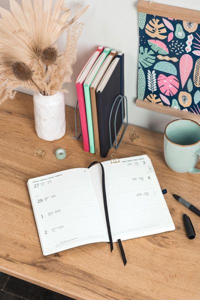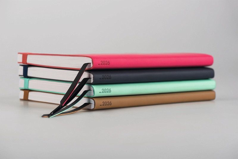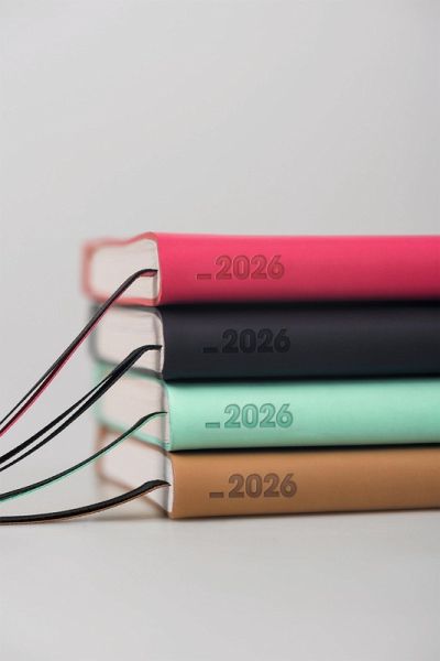 Blattgröße: 148 × 210 mm 2 Seiten = 1 Woche 144 Seiten, Druckfarbe Kalendarium: schwarz 80 g/m², Qualitätspapier, cremefarben, tintenfest, Fadenheftung viersprachig: deutsch, englisch, französisch, italienisch PU-Einband, Farbe: dunkelblau Jahresübersicht aktuelles Jahr und 2 Folgejahre, 4 Seiten Monatsplan aktuelles Jahr, 6 Seiten Monatsplan Folgejahr, Ferientermine Deutschland und Österreich, 3 Seiten Notizen liniert, 16 Seiten Notizen blanko perforiert, auswechselbares Adressheft, 16 Seiten Gummizugverschluss mit Einstecktasche und Stiftschlaufe Zeichenband für Kalenderjahr 2026