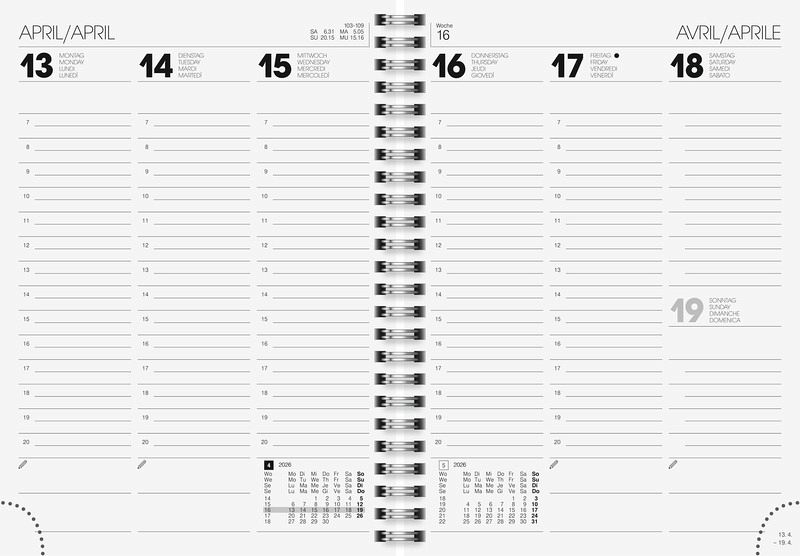 Blattgröße: 148 × 208 mm 2 Seiten = 1 Woche 128 Seiten, Druckfarbe Kalendarium: schwarz 70 g/m², Wire-O-Bindung viersprachig: deutsch, englisch, französisch, italienisch Naturkarton-Umschlag, Farbe: schwarz 4 Seiten Monatsplan aktuelles Jahr, 4 Seiten Folgejahr, Ferientermine Deutschland, Österreich, Frankreich und Luxemburg, 12 Seiten Wissenswertes halbstündliche Einteilung von 7-20 Uhr, nicht Sa. und So. Eckperforation für Kalenderjahr 2026