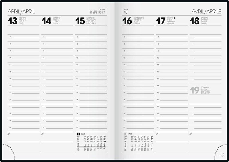 Blattgröße: 148 × 208 mm 2 Seiten = 1 Woche 128 Seiten, Druckfarbe Kalendarium: schwarz 70 g/m², Klebebindung viersprachig: deutsch, englisch, französisch, italienisch Grafik-Einband, Farbe: bunt 4 Seiten Monatsplan aktuelles Jahr, 4 Seiten Folgejahr, Ferientermine Deutschland, Österreich, Frankreich und Luxemburg, 12 Seiten Wissenswertes halbstündliche Einteilung von 7-20 Uhr, nicht Sa. und So. Eckperforation für Kalenderjahr 2026