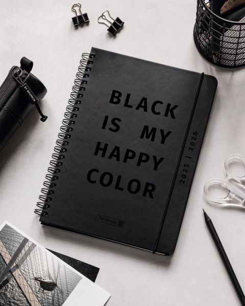 Blattgröße: 148 × 210 mm 2 Seiten = 1 Woche 208 Seiten, Druckfarbe Kalendarium: grau Wire-O-Bindung Kalendarium: 18 Monate Juli 2025 bis Dezember 2026 viersprachig: deutsch, englisch, französisch, italienisch Grafik-Einband, Hardcover, abgerundete Ecken, Farbe: schwarz, partielle Glanzlackveredelung Monatsplan April 2025 bis Dezember 2026, Ferientermine Deutschland, Österreich, Schweiz, Frankreich, Belgien, Luxemburg, Niederlande und Südtirol, 9 Seiten Notizen, 2 Seiten Stundenpläne und 2 Seiten Notenübersicht, 6 Seiten Adressen Gummizugverschluss mit Lineal Eckperforation für Kalenderjahr 2025/2026