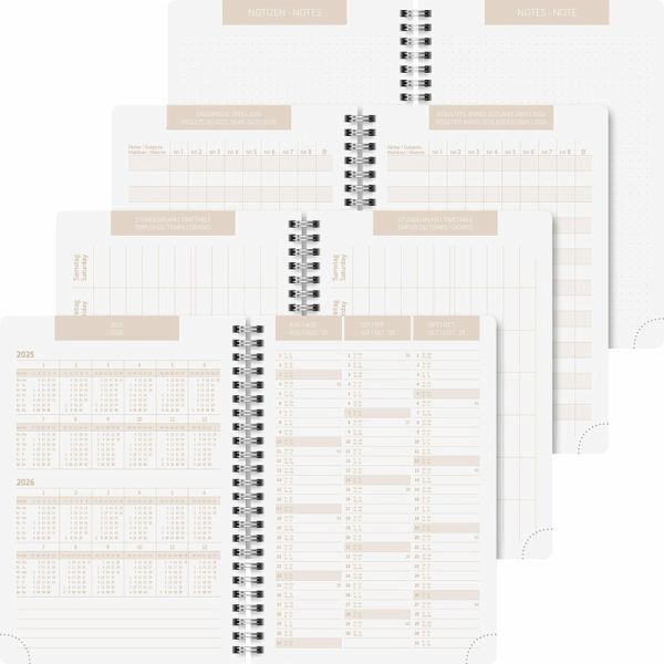 Blattgröße: 148 × 210 mm 2 Seiten = 1 Woche 208 Seiten, Druckfarbe Kalendarium: beige Wire-O-Bindung Kalendarium: 18 Monate Juli 2025 bis Dezember 2026 viersprachig: deutsch, englisch, französisch, italienisch Kraftpapier-Einband, Hardcover, abgerundete Ecken, Farbe: weiß, braun Monatsplan April 2025 bis Dezember 2026, Ferientermine Deutschland, Österreich, Schweiz, Frankreich, Belgien, Luxemburg, Niederlande und Südtirol, 9 Seiten Notizen, 2 Seiten Stundenpläne und 2 Seiten Notenübersicht, 6 Seiten Adressen Gummizugverschluss mit Lineal Eckperforation für Kalenderjahr 2025/2026