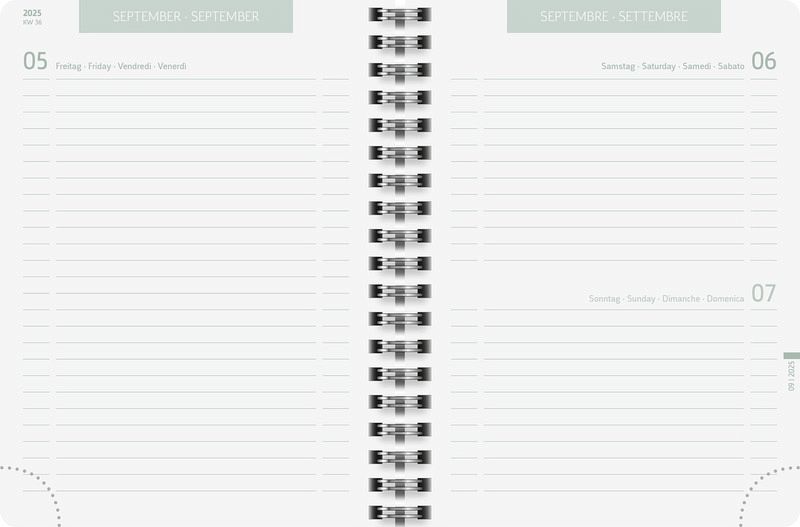Blattgröße: 120 × 160 mm 1 Seite = 1 Tag, Sa. und So. auf einer Seite 352 Seiten, Druckfarbe Kalendarium: grün Wire-O-Bindung Kalendarium: August 2025 bis Juli 2026 viersprachig: deutsch, englisch, französisch, italienisch PP-Einband, Softcover, flexibel, abgerundete Ecken, Farbe: mint, partielle Folienveredelung Monatsplan August 2025 bis Dezember 2026, Ferientermine Deutschland, Österreich, Schweiz, Frankreich, Belgien, Luxemburg, Niederlande und Südtirol, 3 Seiten Notizen, 2 Seiten Stundenpläne und 2 Seiten Notenübersicht Gummizugverschluss mit Lineal und Sammeltasche Eckperforation für Kalenderjahr 2025/2026