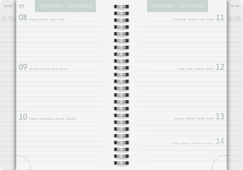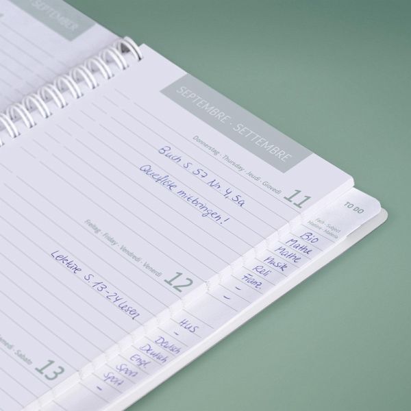 Blattgröße: 148 × 210 mm 2 Seiten = 1 Woche 208 Seiten, Druckfarbe Kalendarium: grün Wire-O-Bindung Kalendarium: 18 Monate Juli 2025 bis Dezember 2026 viersprachig: deutsch, englisch, französisch, italienisch PP-Einband, Softcover, flexibel, abgerundete Ecken, Farbe: mint, partielle Folienveredelung Monatsplan April 2025 bis Dezember 2026, Ferientermine Deutschland, Österreich, Schweiz, Frankreich, Belgien, Luxemburg, Niederlande und Südtirol, 9 Seiten Notizen, 2 Seiten Stundenpläne und 2 Seiten Notenübersicht, 6 Seiten Adressen Gummizugverschluss mit Lineal und Sammeltasche mit Seitenleiste: Unterrichtsfächer nur einmal eintragen. Die Fächer müssen nicht Woche für Woche vorgetragen werden. Eckperforation für Kalenderjahr 2025/2026