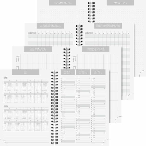 Blattgröße: 148 × 210 mm 2 Seiten = 1 Woche 208 Seiten, Druckfarbe Kalendarium: grau Wire-O-Bindung Kalendarium: 18 Monate Juli 2025 bis Dezember 2026 viersprachig: deutsch, englisch, französisch, italienisch Naturkarton-Umschlag, Softcover, flexibel, abgerundete Ecken, Farbe: schwarz, partielle Folienveredelung Monatsplan April 2025 bis Dezember 2026, Ferientermine Deutschland, Österreich, Schweiz, Frankreich, Belgien, Luxemburg, Niederlande und Südtirol, 9 Seiten Notizen, 2 Seiten Stundenpläne und 2 Seiten Notenübersicht, 6 Seiten Adressen Gummizugverschluss Eckperforation für Kalenderjahr 2025/2026