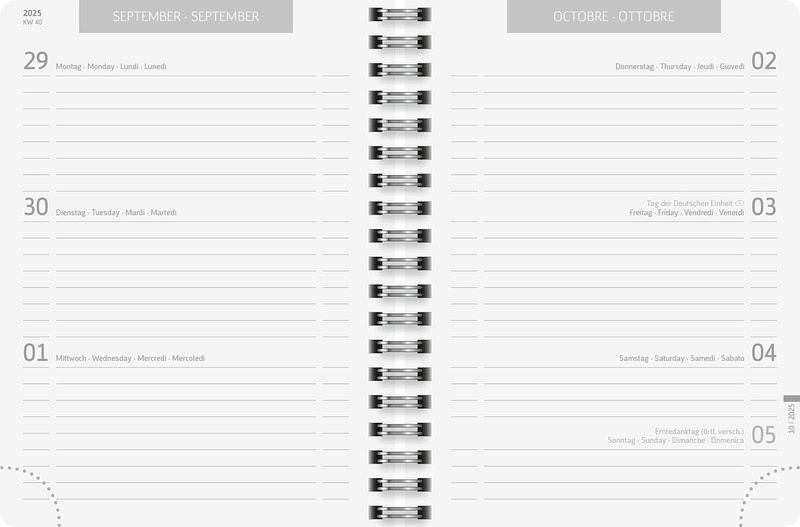 Blattgröße: 120 × 160 mm 2 Seiten = 1 Woche 208 Seiten, Druckfarbe Kalendarium: grau Wire-O-Bindung Kalendarium: 18 Monate Juli 2025 bis Dezember 2026 viersprachig: deutsch, englisch, französisch, italienisch Naturkarton-Umschlag, Softcover, flexibel, abgerundete Ecken, Farbe: schwarz, partielle Folienveredelung Monatsplan April 2025 bis Dezember 2026, Ferientermine Deutschland, Österreich, Schweiz, Frankreich, Belgien, Luxemburg, Niederlande und Südtirol, 9 Seiten Notizen, 2 Seiten Stundenpläne und 2 Seiten Notenübersicht, 6 Seiten Adressen Gummizugverschluss Eckperforation für Kalenderjahr 2025/2026