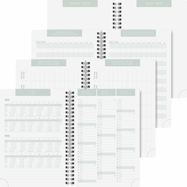 Blattgröße: 148 × 210 mm 2 Seiten = 1 Woche 208 Seiten, Druckfarbe Kalendarium: grün Wire-O-Bindung Kalendarium: 18 Monate Juli 2025 bis Dezember 2026 viersprachig: deutsch, englisch, französisch, italienisch Recyclingleder-Umschlag, Softcover, flexibel, abgerundete Ecken, Farbe: mehrfarbig Monatsplan April 2025 bis Dezember 2026, Ferientermine Deutschland, Österreich, Schweiz, Frankreich, Belgien, Luxemburg, Niederlande und Südtirol, 9 Seiten Notizen, 2 Seiten Stundenpläne und 2 Seiten Notenübersicht, 6 Seiten Adressen Gummizugverschluss mit Lineal und Sammeltasche Eckperforation für Kalenderjahr 2025/2026