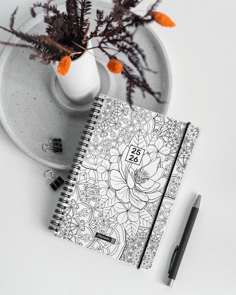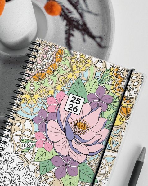 Blattgröße: 148 × 210 mm 2 Seiten = 1 Woche 208 Seiten, Druckfarbe Kalendarium: grau Wire-O-Bindung Kalendarium: 18 Monate Juli 2025 bis Dezember 2026 viersprachig: deutsch, englisch, französisch, italienisch PP-Einband, Softcover, flexibel, abgerundete Ecken, Farbe: weiß, schwarz Monatsplan April 2025 bis Dezember 2026, Ferientermine Deutschland, Österreich, Schweiz, Frankreich, Belgien, Luxemburg, Niederlande und Südtirol, 9 Seiten Notizen, 2 Seiten Stundenpläne und 2 Seiten Notenübersicht, 6 Seiten Adressen Gummizugverschluss mit Lineal und Sammeltasche Vorder- und Rückseite mit ZENart-Motiv zum Ausmalen Eckperforation für Kalenderjahr 2025/2026
