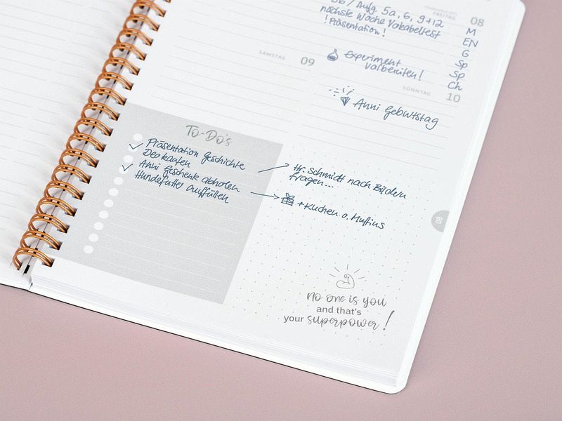 Blattgröße: 148 × 210 mm 2 Seiten = 1 Woche 176 Seiten, Druckfarbe Kalendarium: grau Wire-O-Bindung Kalendarium: August 2025 bis Juli 2026 deutsch PP-Einband, Softcover, flexibel, abgerundete Ecken, Farbe: grün Monatsplan August 2025 bis Dezember 2026, Ferientermine Deutschland, Österreich, Schweiz , 2 Seiten Stundenpläne, 2 Seiten Notenübersicht, Mood und Habit Tracker für Kalenderjahr 2025/2026