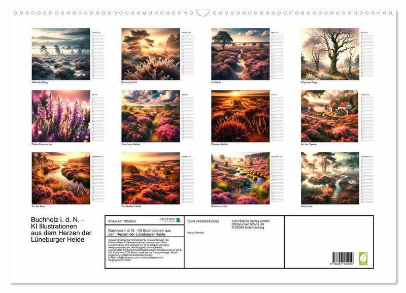 Dieses Projekt fängt die leuchtenden Farben der Lüneburger Heide ein, besonders zur Blütezeit im August, wenn sich die Landschaft in ein purpurnes Meer verwandelt. Jedes Kalenderblatt eröffnet einen neuen Blick auf die Gegend um Buchholz in der Nordheide, von der idyllischen Weseler Heide bis zum geheimnisvollen Radenbachtal. Die sorgfältig ausgewählten Bilder zelebrieren die Schönheit der Heide und laden zur Erkundung ihrer einzigartigen Landschaft ein. Ein Muss für jeden, der die Heidelandschaften zur Blütezeit liebt und sich von der Pracht der Natur inspirieren lässt. Abschließend sei erwähnt, dass die Illustrationen von KI entworfen wurden, was dem Kalender eine einzigartige Note verleiht.