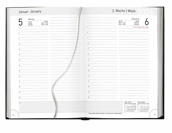 Hochwertiger Buchkalender. Hardcover schwarz. 352 Seiten. Pro Wochentag 1 Seite. Sa/So 1 Seite. Kalendarium d-e-f-i.