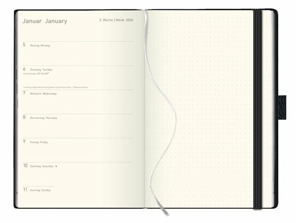 Hochwertiger Terminkalender. Auf der linken Seite die Wochenübersicht und auf der rechten Seite viel Platz für Notizen. Hardcover schwarz. 144 Seiten. 12-monatiges Kalendarium in Deutsch und Englisch.