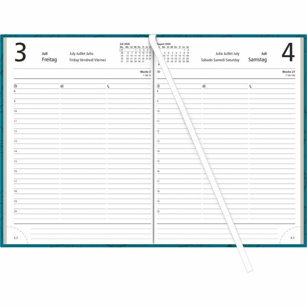 Wir setzen auf Nachhaltigkeit - dieser Buchkalender wurde aus Recyclingpapier hergestellt. Er überzeugt vor allem durch das praktische Handtaschenformat und seinen stabilen Kartoneinband. Das übersichtliche Kalendarium bietet Ihnen pro Tag eine Seite. Die Uhrzeiteneinteilung von 7 bis 19 Uhr ermöglicht Ihnen komfortables Planen und Eintragen aller Termine. Auf jeder Doppelseite finden Sie außerdem eine Übersicht des aktuellen und folgenden Monats. Zudem liefert der Buchkalender viele Zusatzinformationen, wie zum Beispiel die Feiertage, Ferientermine, Telefonvorwahlen und vieles mehr. Auf den letzten Seiten des Kalenders finden Sie auch einen Adressbereich und Platz für weitere Notizen. So haben Sie alle wichtigen Informationen stets parat. Aufgrund seiner Kompaktheit ist dieser Buchkalender daher ideal für zuhause und unterwegs.
