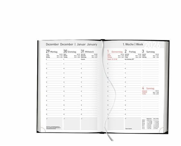 Buchkalender im Format: 14 x 20,5 cm, 128 Seiten Pro Woche eine Doppelseite Extras: Jahresübersicht 2026/27, Platz für Notizen, Infoseiten rund um geschäftliche Themen Kalendarium auf Deutsch, Englisch, Französisch und Italienisch; Feiertage für Deutschland, Österreich und Schweiz Lesebändchen sowie praktische Eckperforationen; Anzeige der Mondphasen sowie Aufgangs- und Untergangszeiten von Sonne und Mond