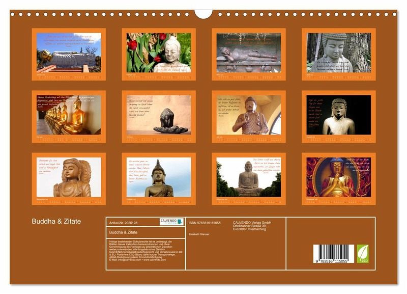 QUALITÄT - Hochwertiger Fotokalender mit 12 wunderschönen Motiven auf lichtbeständigem Bilderdruckpapier, robuste Spiralbindung mit Aufhängebügel.NACHHALTIG - deutliche Abfallreduzierung durch bedarfsgerechte Einzelstückfertigung, umweltfreundliches FSC-zertifiziertes Papier, Produktion in Deutschland, klimabewusste Logistik.PERFEKTES GESCHENK - Kalender für Freunde und Familie, für Kinder und Erwachsene, jung und alt, zu Weihnachten, Geburtstag oder zwischendurch.VIELFALT - Bildkalender in verschiedenen Formaten, z.B. DIN A5, DIN A4, DIN A3 sowie DIN A2. Ob Naturmotiv, Gemälde oder Fotos, ideal für ein persönliches Wohlfühlambiente.Buddha-Statuen und weise Zitate für ein positives Lebensgefühl von Autor(in): Elisabeth Stanzer