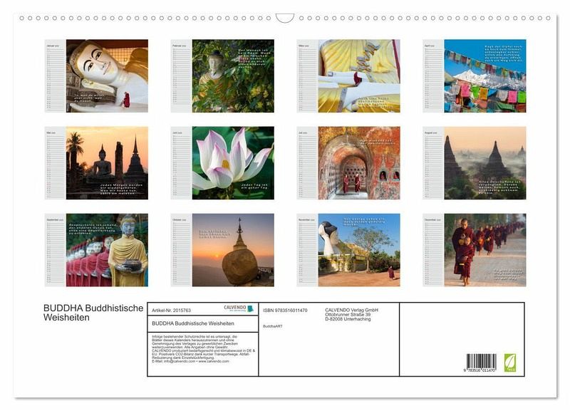 Buddhas Worte und Ratschläge sind in allen Lebenslagen hilfreich und wohltuend. Dieser Kalender erfreut Sie jeden Monat aufs Neue mit buddhistischen Weisheiten in Kombination mit ästhetischen Fotografien.