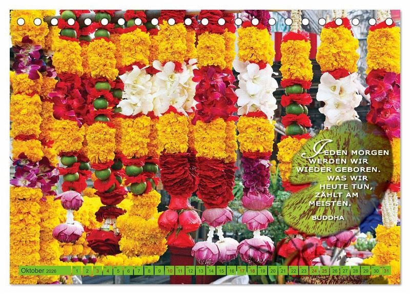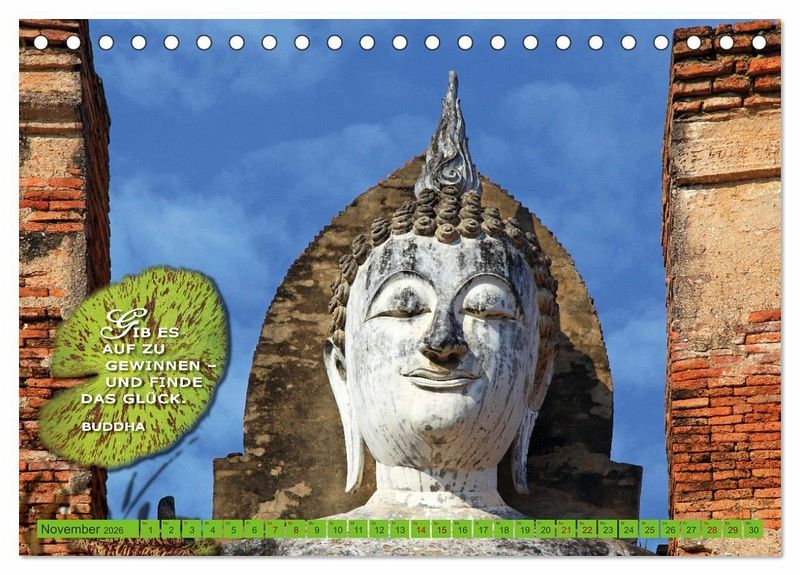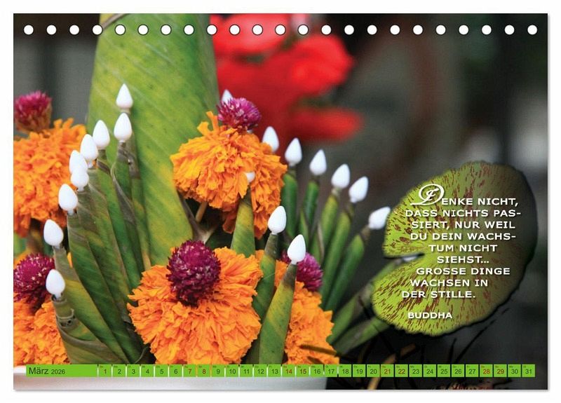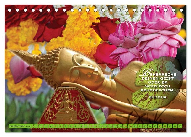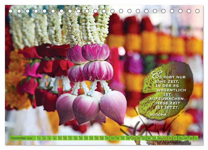 Entdecken Sie die zeitlose Weisheit des Buddhismus jeden Tag mit dem wunderschönen "Buddha's Worte - Der Weg zur Achtsamkeit" Kalender. Dieser inspirierende Kalender ist eine tägliche Quelle der Erleuchtung und Achtsamkeit.Jeder Monat des Jahres ist mit einem Zitat aus den Lehren Buddhas liebevoll gestaltet. Die kurzen, aber kraftvollen Worte führen Sie sanft auf den Pfad der Achtsamkeit und inneren Harmonie. Tauchen Sie ein in die tiefe Weisheit des Buddhismus und finden Sie Inspiration für Ihr tägliches Leben.Der Kalender ist ästhetisch sehr ansprechend gestaltet mit Bildern der Reisefotografin Gabriele Gerner, die insgesamt mehrere Jahre in Asien verbracht hat. Bringen Sie Ruhe, Klarheit und Harmonie in Ihr Leben und lassen sie sich den Weg zur Achtsamkeit zeigen.