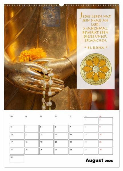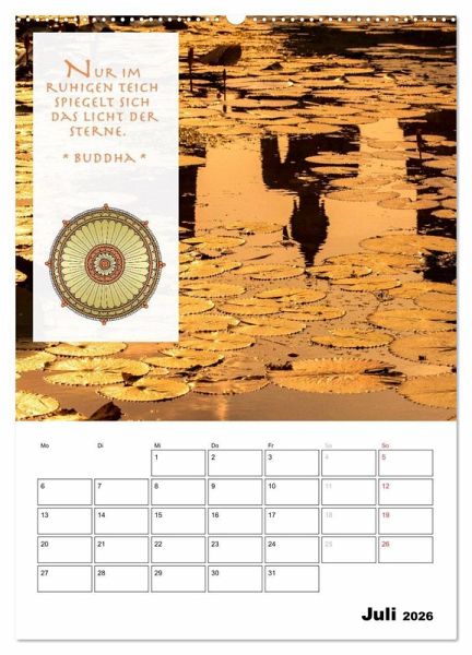 Dieser Kalender mit Planungs-Funktion zeigt zwölf meditative Fotografien mit je einem Spruch von Buddha. Worte und Weisheiten, die wir in allen erdenklichen Lebenslagen anwenden können. Dieser wunderschöne Kalender ist Wellness für Ihre Seele.