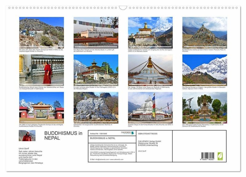 Rund 80 Prozent aller Nepalesen bekennen sich zum Hinduismus und etwa 10 Prozent zum Buddhismus. Historisch bedingt bestehen in Nepal zwischen beiden Religionen enge Beziehungen. Besonders die nördlichen Bergregionen sind überwiegend vom tibetischen Buddhismus geprägt. Im heutigen Lumbini wurde der Überlieferung nach der Begründer des Buddhismus, Siddharta Gautama, später Buddha genannt, geboren. Der Autor bereiste viele Male den faszinierenden Himalayastaat mit seiner eindrucksvollen Landschaft, aber auch großartigen Geschichte und präsentiert im Kalender beeindruckende Bilder von buddhistischen Bauwerken und Kultstätten.
