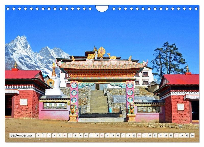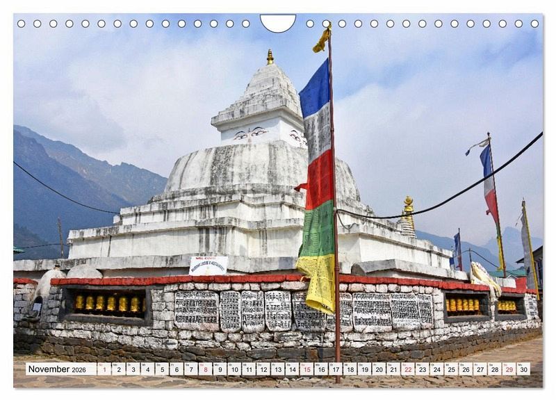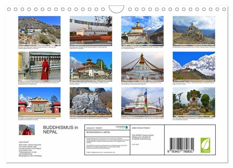 Rund 80 Prozent aller Nepalesen bekennen sich zum Hinduismus und etwa 10 Prozent zum Buddhismus. Historisch bedingt bestehen in Nepal zwischen beiden Religionen enge Beziehungen. Besonders die nördlichen Bergregionen sind überwiegend vom tibetischen Buddhismus geprägt. Im heutigen Lumbini wurde der Überlieferung nach der Begründer des Buddhismus, Siddharta Gautama, später Buddha genannt, geboren. Der Autor bereiste viele Male den faszinierenden Himalayastaat mit seiner eindrucksvollen Landschaft, aber auch großartigen Geschichte und präsentiert im Kalender beeindruckende Bilder von buddhistischen Bauwerken und Kultstätten.