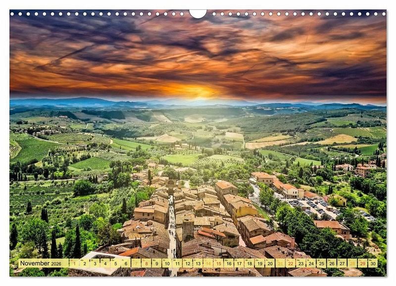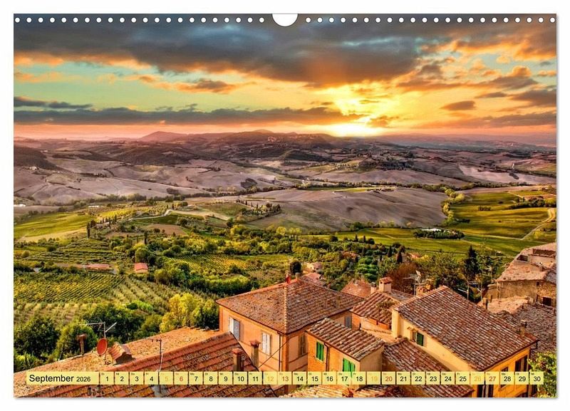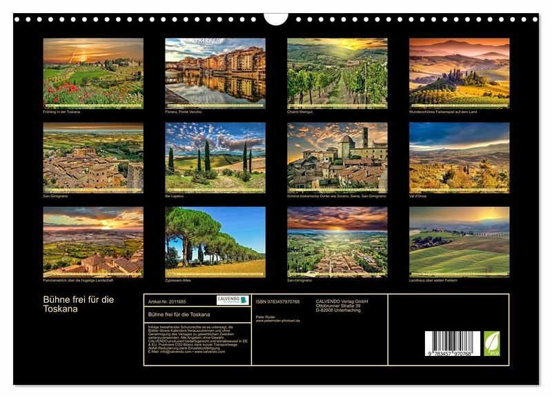 ENIT - Italienische Zentrale für Tourismus - schreibt auf ihrer Seite Italia.it: "Die Toskana liegt in Mittelitalien und erstreckt sich vom Apennin bis ans Tyrrhenische Meer. Ihre Landschaft und Kunstschätze und bedeutende Städte wie Florenz machen die Toskana zu einem Hauptanziehungspunkt des internationalen Tourismus. Zahlreiche Sehenswürdigkeiten dieser Region sind von der UNESCO zum Weltkulturerbe erklärt worden," Für diesen Kalender hat der Fotokünstler Peter Roder zwölf wunderschöne Aufnahmen dieser einzigartigen Landschaft zusammengestellt und gestaltet, ein zauberhafter Hingucker für das ganze Jahr.
