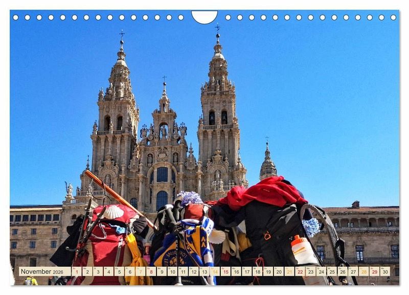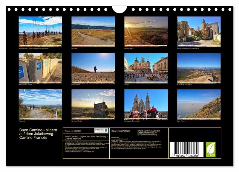 Jakobsweg, Camino de Santiago, Bezeichnung für eine Reihe von Pilgerwegen in Europa, die alle das angebliche Grab des Apostels Jakobus in Santiago de Compostela in Spanien zum Ziel haben. Hauptsächlich ist jedoch der Weg Camino Francés gemeint, der von den Pyrenäen nach Santiago de Compostela führt. Ein wunderschöner Kalender für alle, die diesen Weg schon einmal gegangen sind, ihn noch gehen wollen oder einfach Freude daran haben.