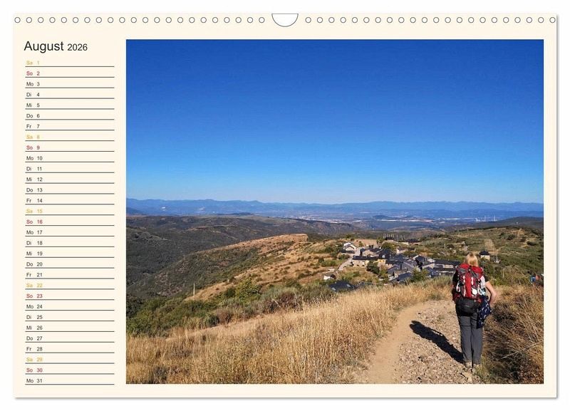 Jakobsweg, Camino de Santiago, Bezeichnung für eine Reihe von Pilgerwegen in Europa, die alle das angebliche Grab des Apostels Jakobus in Santiago de Compostela in Spanien zum Ziel haben. Hauptsächlich ist jedoch der Weg Camino Francés gemeint, der von den Pyrenäen nach Santiago de Compostela führt. Ein wunderschöner Kalender für alle, die diesen Weg schon einmal gegangen sind, ihn noch gehen wollen oder einfach Freude daran haben.