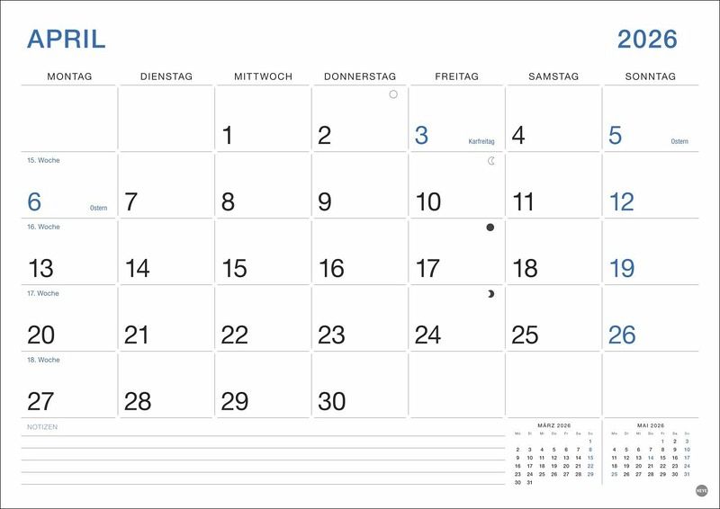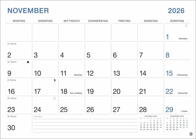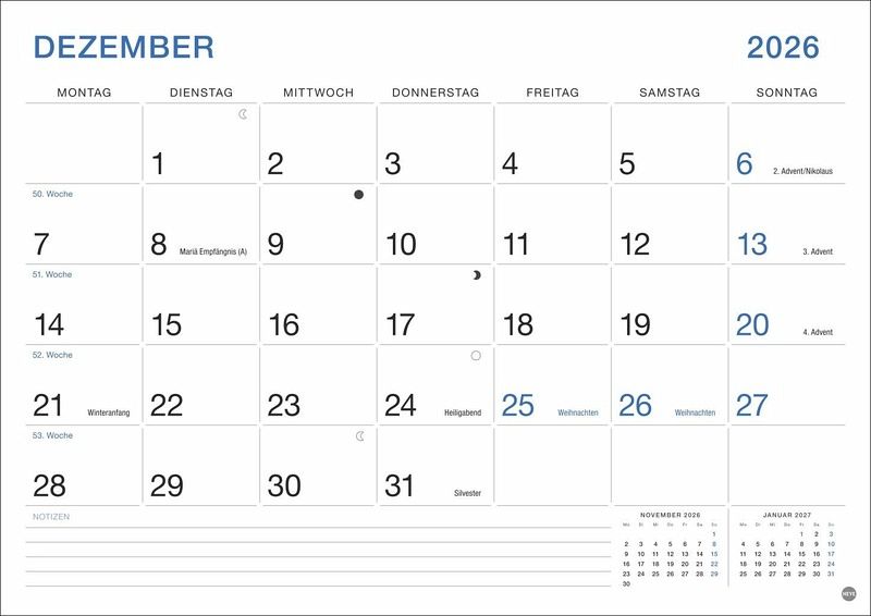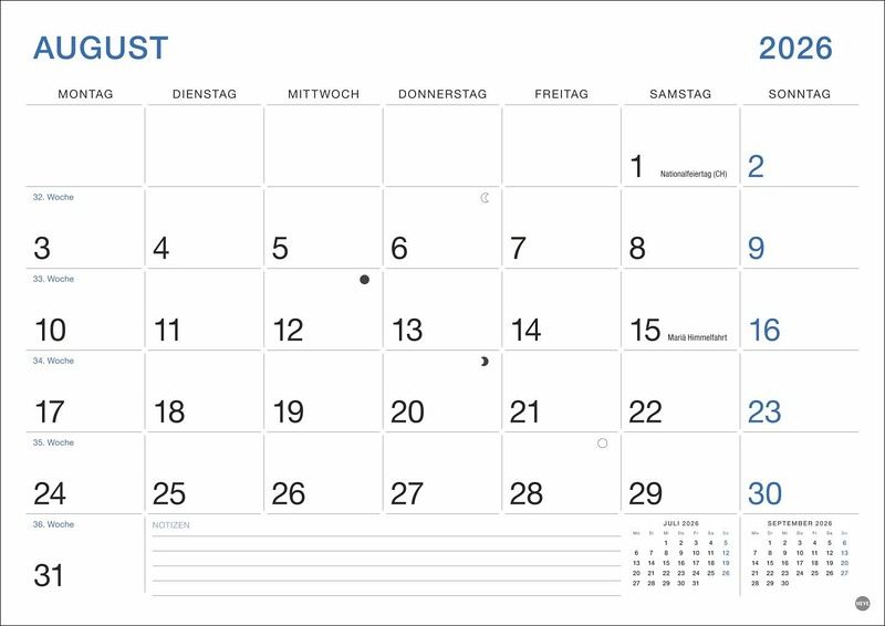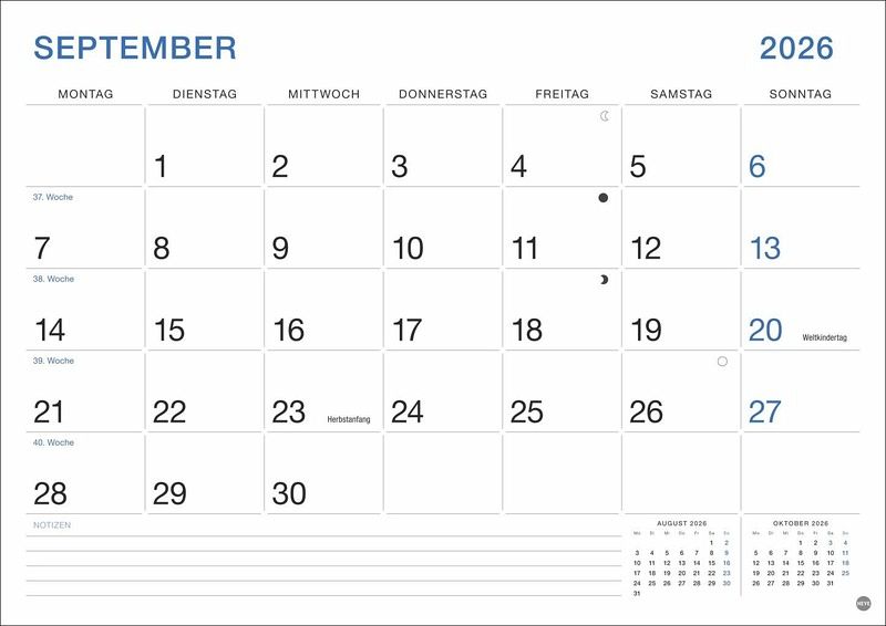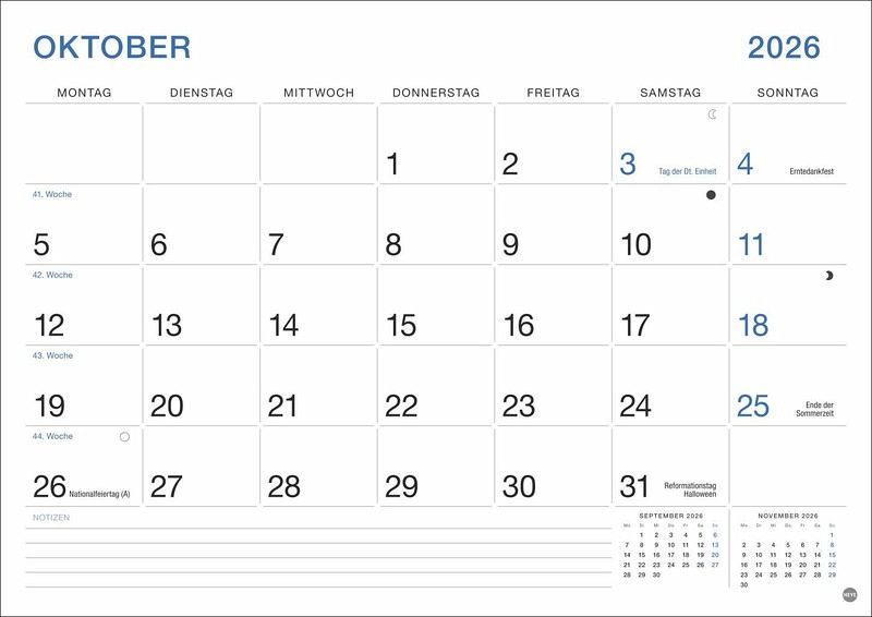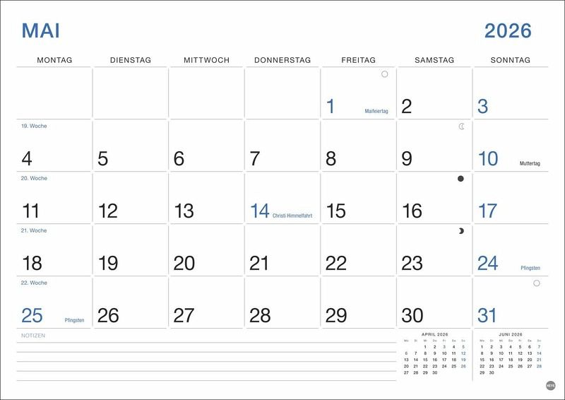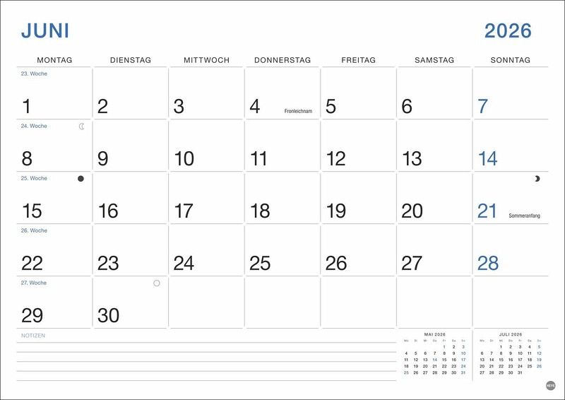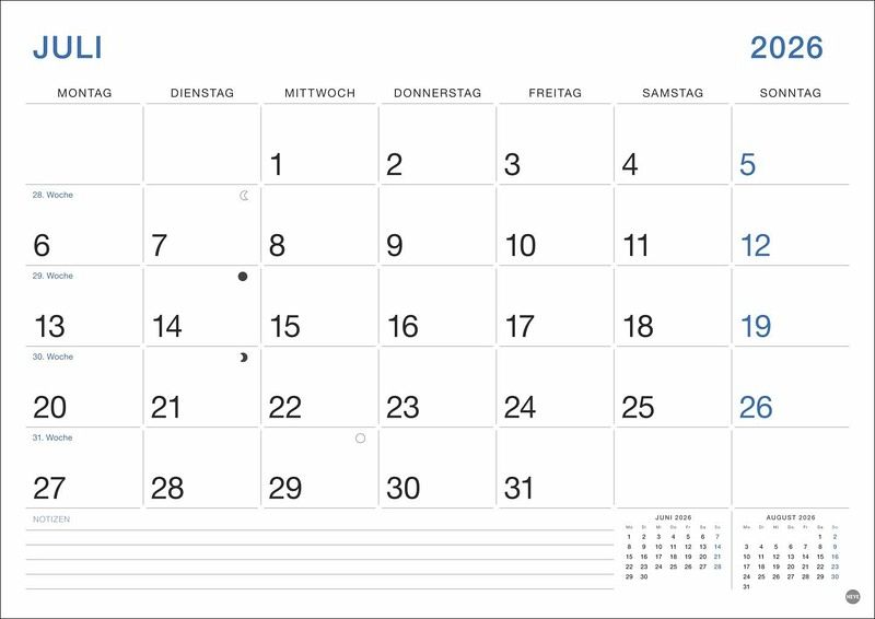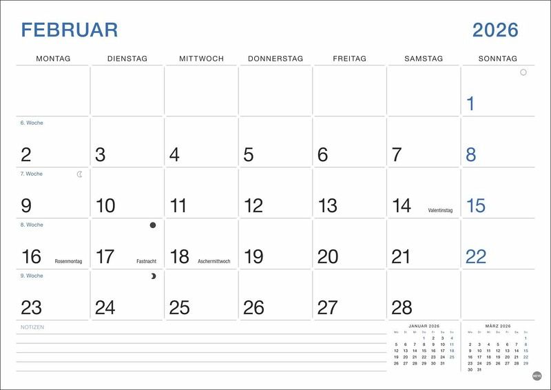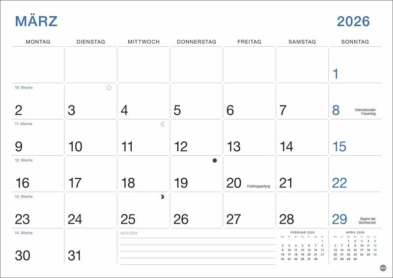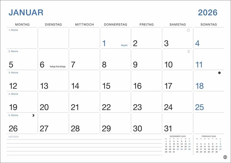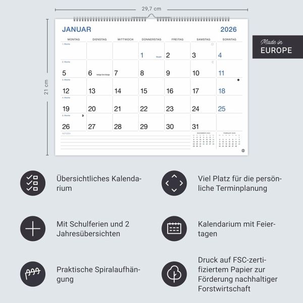 - Alle Termine und To Dos im Blick: Planungs-Kalender 2026 mit großzügigem Kalendarium für Eintragungen- Gut strukturiert durch den Arbeitstag: Terminplaner mit Notizfeld auf jeder Seite und Übersichten zum Vor- und Folgemonat- Volle Konzentration auf das Wesentliche: Neutraler Kalender im A4-Querformat und 29,7 x 21 cm Seitenlänge- Die perfekte Organisationshilfe fürs Büro: Wandkalender mit zwei Jahresübersichten und Schulferien- Für alle, die das Terminchaos schlicht und einfach im Griff haben wollen: Die neutralen Kalender von Heye im Athesia-Kalenderverlag