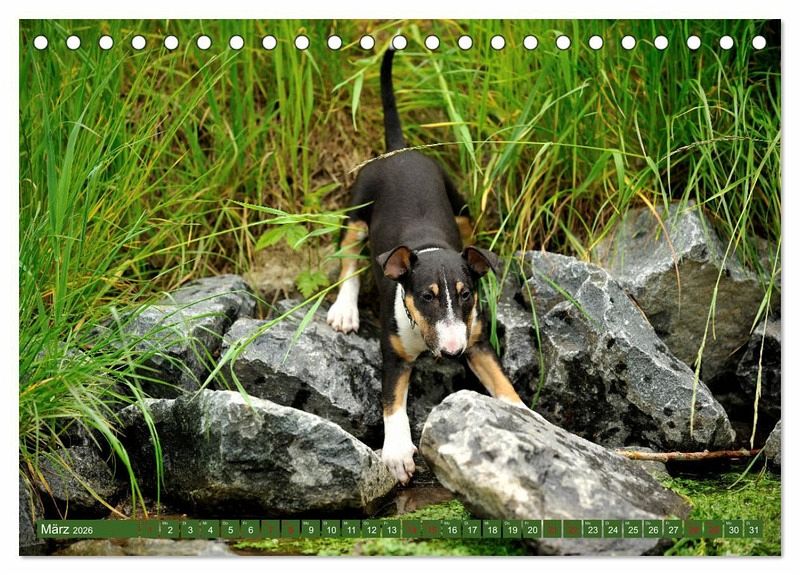 Januar: Bullterrierjunghund guckt neugierig um sich