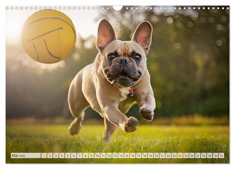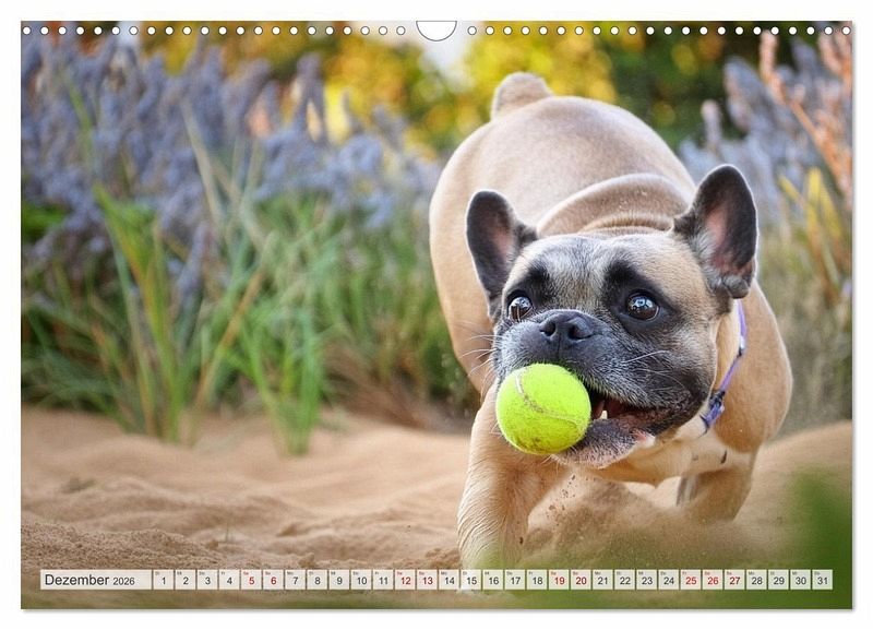 Dezember: Eine Französische bulldogge fängt einen Ball im Sand