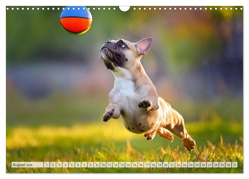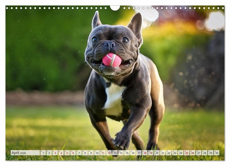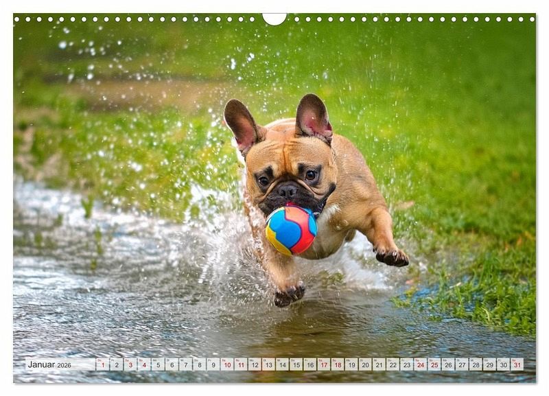 Januar: Französische Bulldogge mit Ball und Wasserspaß