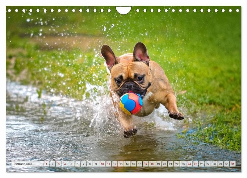 Januar: Französische Bulldogge mit Ball und Wasserspaß