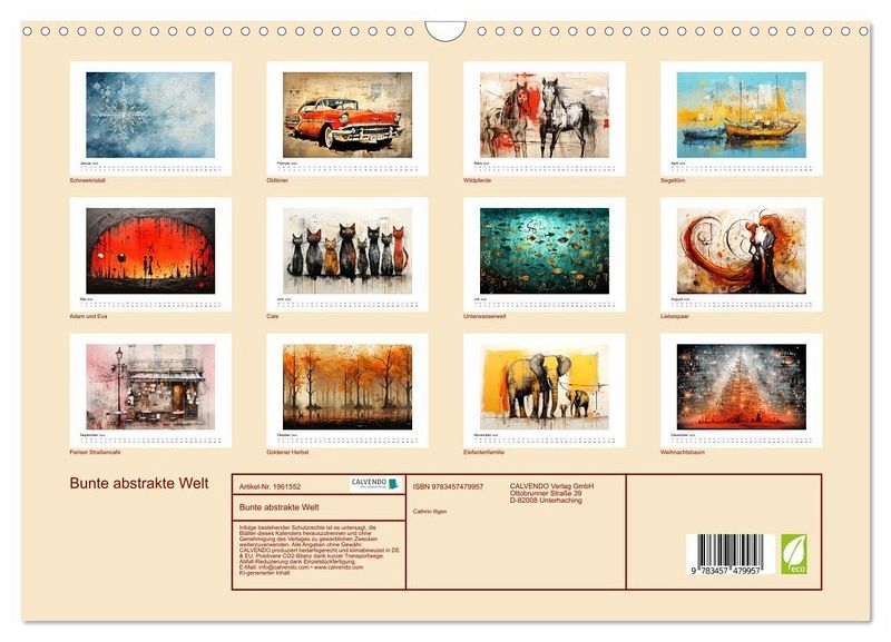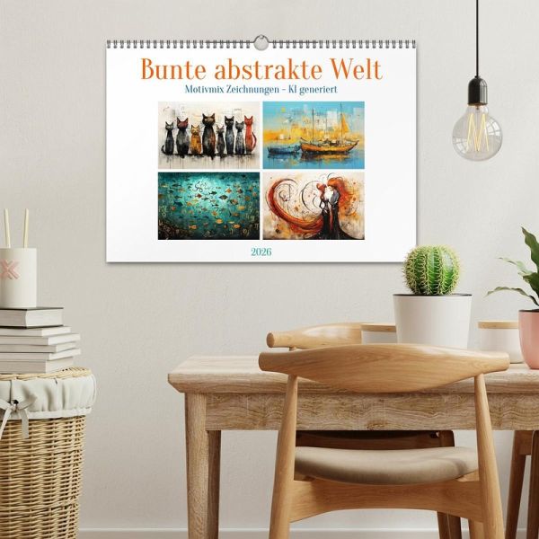 QUALITÄT - Hochwertiger Fotokalender mit 12 wunderschönen Motiven auf lichtbeständigem Bilderdruckpapier, robuste Spiralbindung mit Aufhängebügel.NACHHALTIG - deutliche Abfallreduzierung durch bedarfsgerechte Einzelstückfertigung, umweltfreundliches FSC-zertifiziertes Papier, Produktion in Deutschland, klimabewusste Logistik.PERFEKTES GESCHENK - Kalender für Freunde und Familie, für Kinder und Erwachsene, jung und alt, zu Weihnachten, Geburtstag oder zwischendurch.VIELFALT - Bildkalender in verschiedenen Formaten, z.B. DIN A5, DIN A4, DIN A3 sowie DIN A2. Ob Naturmotiv, Gemälde oder Fotos, ideal für ein persönliches Wohlfühlambiente.Kunstvolle abstrakte Zeichnungen in lebendigen Farben - KI generiert von Autor(in): Catill