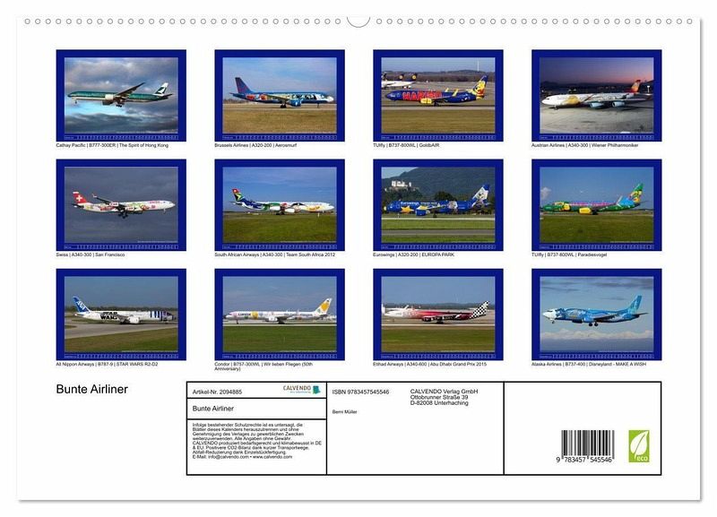 PREMIUM-LINIE - Brillanter Fotokalender mit 12 wunderschönen Motiven, Kunstdruck in Hochglanz in Museumsqualität.QUALITÄT - edle Materialien, stabile Rückwand mit 2 innovativen Einstecktaschen für eine optimale Präsentation an der Wand.NACHHALTIG - deutliche Abfallreduzierung durch bedarfsgerechte Einzelstückfertigung, umweltfreundliches FSC-zertifiziertes Papier, Produktion in Deutschland, klimabewusste Logistik.PERFEKTES GESCHENK - Kalender für Freunde und Familie, für Kinder und Erwachsene, jung und alt, zu Weihnachten, Geburtstag oder zwischendurch.Linienflugzeuge mit Sonderbemalungen von Autor(in): Bernhard Müller