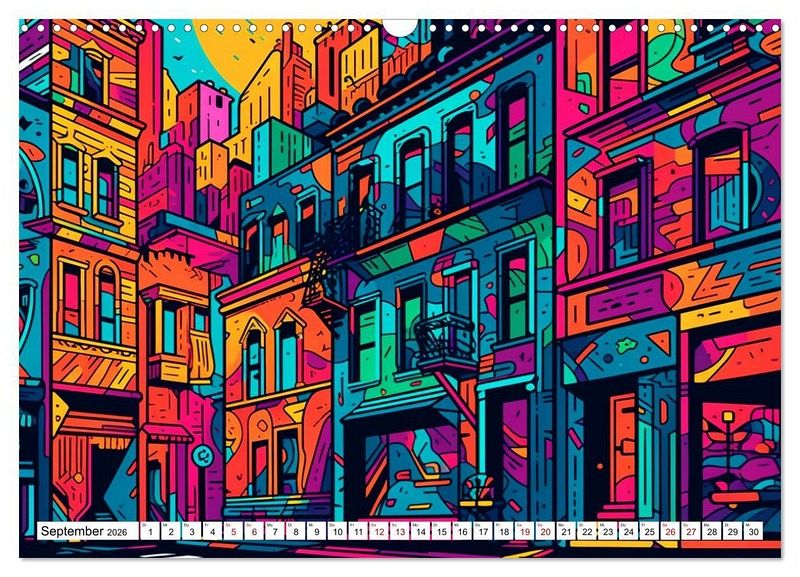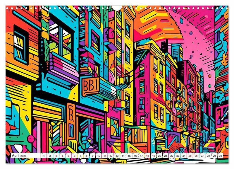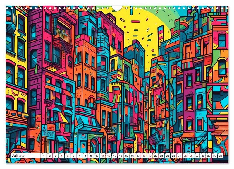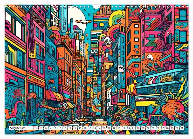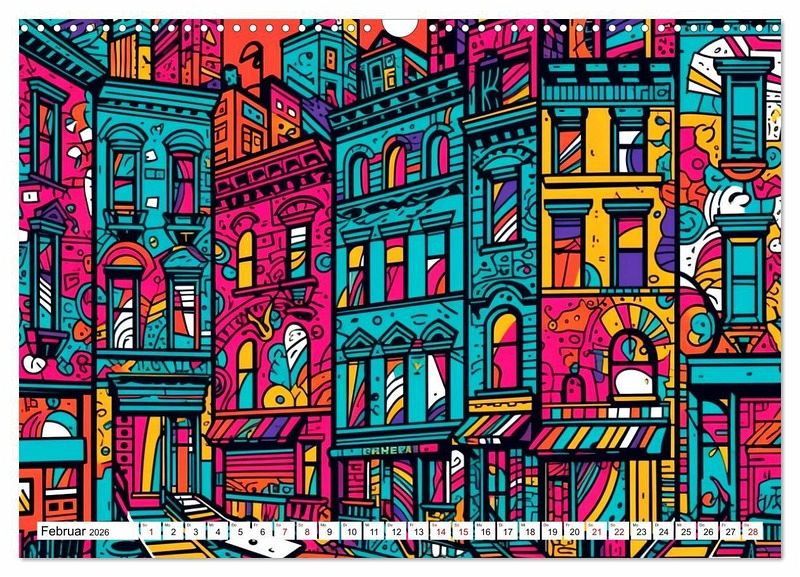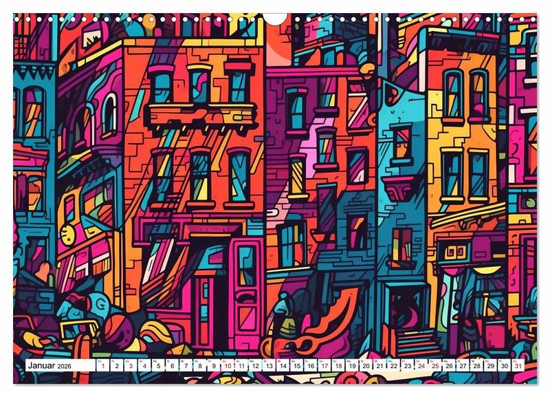 Die zwölf Bilder in diesem Wandkalender zeigen Städte auf eine neue und inspirierende Art und Weise. Jedes Bild ist einzigartig und wird Sie jeden Monat aufs Neue begeistern. Bestellen Sie noch heuteIhren eigenen Wandkalender mit bunten Städten im Rizzo Doodle Style und bringen Sie eine kreative, moderne Note in Ihr Zuhause oder Büro!