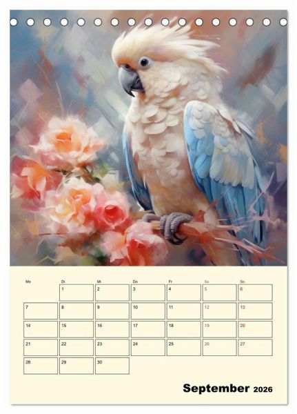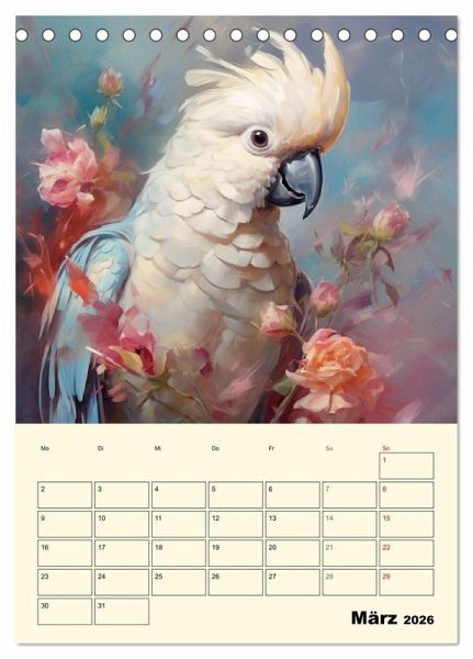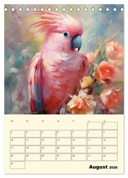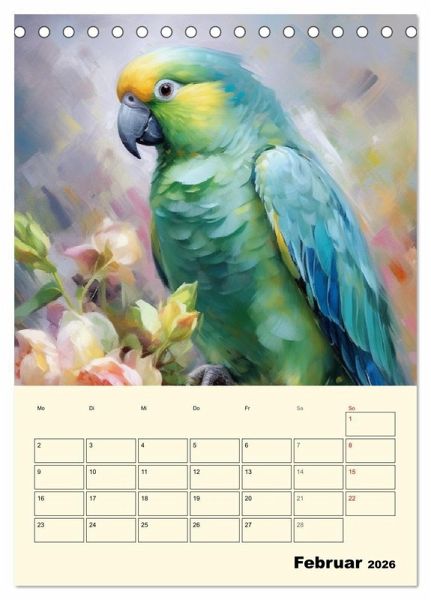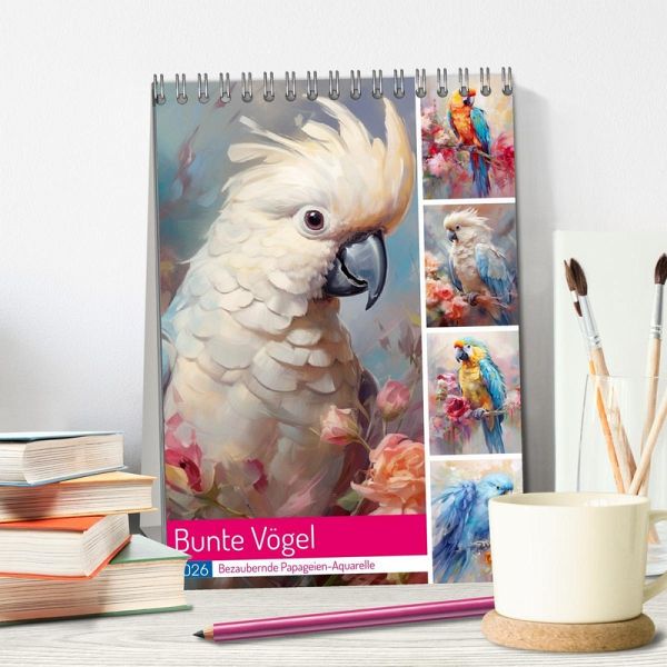 Papageien sind wunderschön und so bunt, dass man es kaum glauben kann. Stattliche Aras, kecke Kakadus und zauberhafte Kleinpapageien sind aber nicht nur wunderschön. Sie sind sehr klug, geschickt und äußerst lernfähig. Diese lieblichen Aquarelle wurden mit KI erstellt und bringen duftige Vogelbilder mit zarten Blumen in ihr Zuhause. Ein zauberhafter Planer für alle Tierfreunde und Vogelliebhaber.