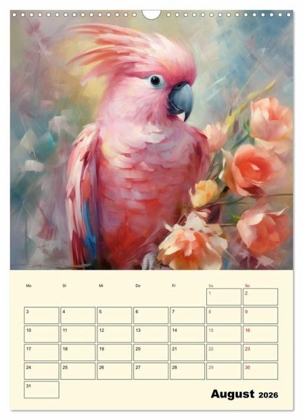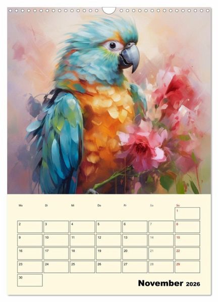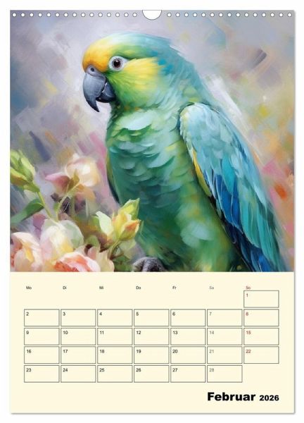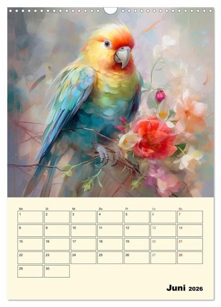 Papageien sind wunderschön und so bunt, dass man es kaum glauben kann. Stattliche Aras, kecke Kakadus und zauberhafte Kleinpapageien sind aber nicht nur wunderschön. Sie sind sehr klug, geschickt und äußerst lernfähig. Diese lieblichen Aquarelle wurden mit KI erstellt und bringen duftige Vogelbilder mit zarten Blumen in ihr Zuhause. Ein zauberhafter Planer für alle Tierfreunde und Vogelliebhaber.