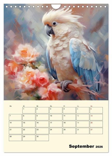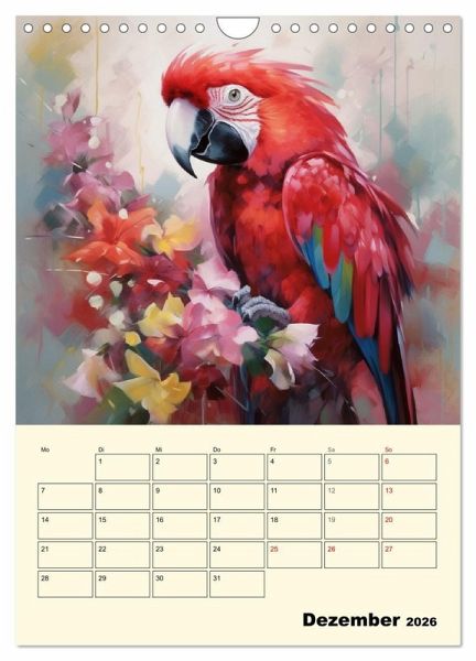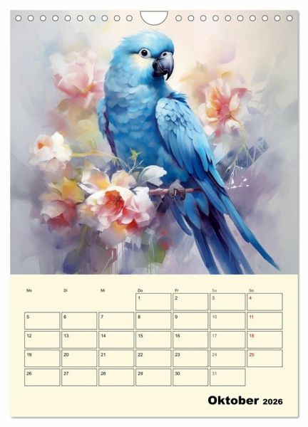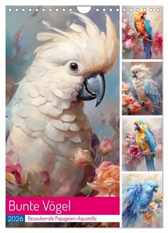 Papageien sind wunderschön und so bunt, dass man es kaum glauben kann. Stattliche Aras, kecke Kakadus und zauberhafte Kleinpapageien sind aber nicht nur wunderschön. Sie sind sehr klug, geschickt und äußerst lernfähig. Diese lieblichen Aquarelle wurden mit KI erstellt und bringen duftige Vogelbilder mit zarten Blumen in ihr Zuhause. Ein zauberhafter Planer für alle Tierfreunde und Vogelliebhaber.
