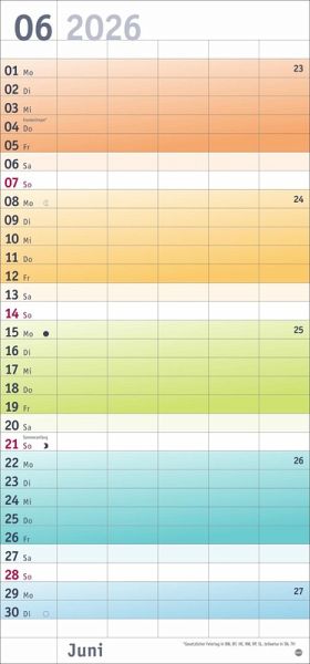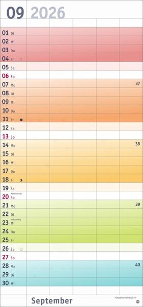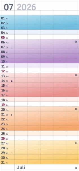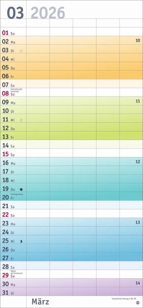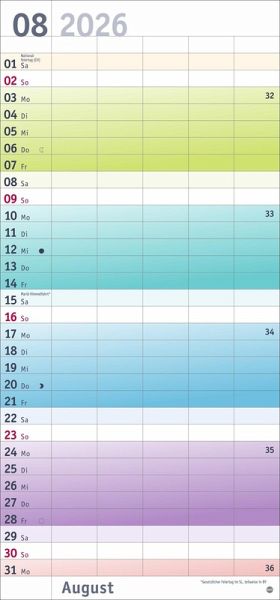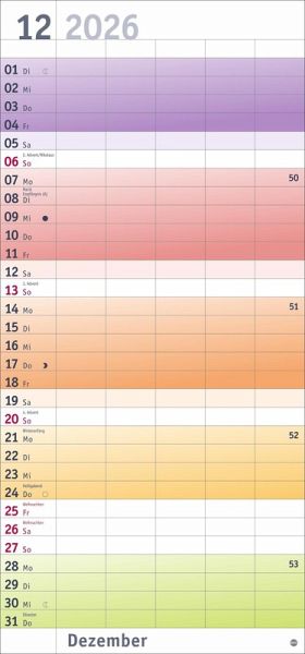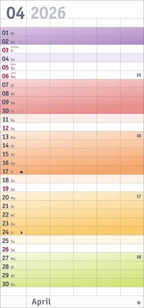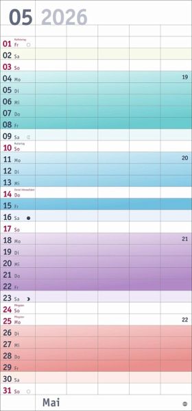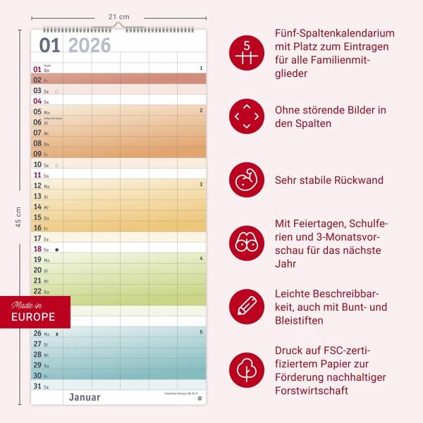 - Die praktische Organisationshilfe, um Licht im Termin-Dschungel zu schaffen: Der bunte Wochen-Familienkalender 2026 - Farbenfroh und gleichzeitig neutral: Kalender ohne platzraubende Designelemente im Format 21x45 cm, der Freiraum für das Wesentliche schafft- Bunt wie das Leben: Woche für Woche ein neuer Farbakzent, der für besseren Überblick sorgt- Unser erfolgreiches Konzept für Familienplaner: 5 Spalten mit ausreichend Platz für Termine, Feste und Freizeitvergnügen, inklusive Schulferien und 3-Monats-Vorschau aufs Folgejahr- So macht Planung Freude: Die Familien-Wandkalender von Heye aus dem Athesia Kalenderverlag