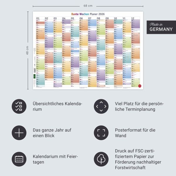 - Nie den Überblick verlieren mit dem 68 x 48 cm Wandkalender 2026 zum Eintragen- Reduziert auf das Wesentliche und doch ein Hingucker: Bunte Wochen - das beliebte Kalender-Design für alle, die viel zu organisieren haben- Das ganze Jahr auf einen Blick: Auf dem Planer als Poster sehen Sie sofort, was in nächster Zeit ansteht- Unterschiedliche Wochenfarben für die perfekte Übersicht: Der Bunte-Wochen-Posterplaner ist eine bewährte Organisationshilfe für jede Lebenslage- Terminkalender für Vielbeschäftigte: Behalten Sie den Überblick mit den Planern von Heye aus dem Athesia Kalenderverlag