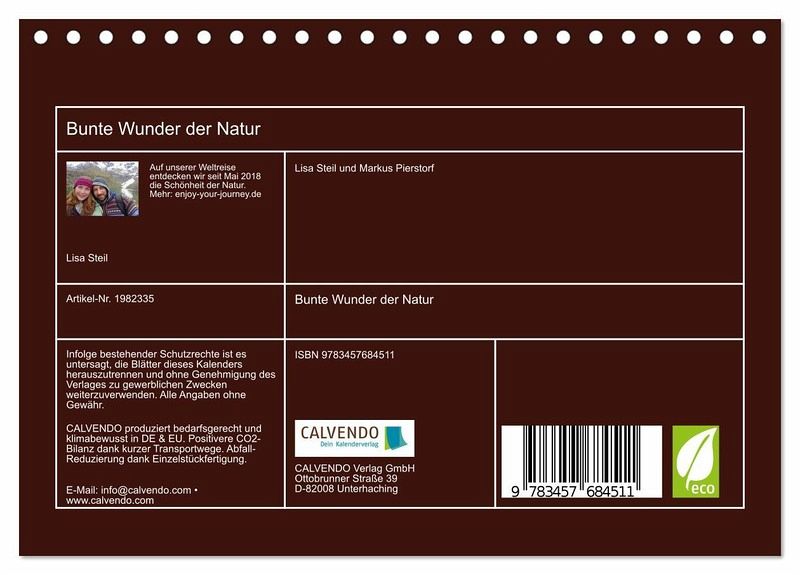 QUALITÄT - Hochwertiger Fotokalender mit 12 wunderschönen Motiven auf lichtbeständigem Bilderdruckpapier, robuste Spiralbindung.NACHHALTIG - deutliche Abfallreduzierung durch bedarfsgerechte Einzelstückfertigung, umweltfreundliches FSC-zertifiziertes Papier, Produktion in Deutschland, klimabewusste Logistik.PERFEKTES GESCHENK - Kalender für Freunde und Familie, für Kinder und Erwachsene, jung und alt, zu Weihnachten, Geburtstag oder zwischendurch.VIELFALT - Bildkalender in verschiedenen Formaten, z.B. DIN A5, DIN A4, DIN A3 sowie DIN A2. Ob Naturmotiv, Gemälde oder Fotos, ideal für ein persönliches Wohlfühlambiente.Impressionen farbenfroher Landschaften entstanden auf der Weltreise von Lisa Steil und Markus Pierstorf von Autor(in): Lisa Steil