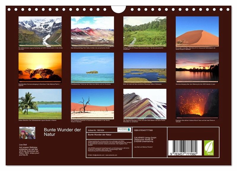 QUALITÄT - Hochwertiger Fotokalender mit 12 wunderschönen Motiven auf lichtbeständigem Bilderdruckpapier, robuste Spiralbindung mit Aufhängebügel.NACHHALTIG - deutliche Abfallreduzierung durch bedarfsgerechte Einzelstückfertigung, umweltfreundliches FSC-zertifiziertes Papier, Produktion in Deutschland, klimabewusste Logistik.PERFEKTES GESCHENK - Kalender für Freunde und Familie, für Kinder und Erwachsene, jung und alt, zu Weihnachten, Geburtstag oder zwischendurch.VIELFALT - Bildkalender in verschiedenen Formaten, z.B. DIN A5, DIN A4, DIN A3 sowie DIN A2. Ob Naturmotiv, Gemälde oder Fotos, ideal für ein persönliches Wohlfühlambiente.Impressionen farbenfroher Landschaften entstanden auf der Weltreise von Lisa Steil und Markus Pierstorf von Autor(in): Lisa Steil