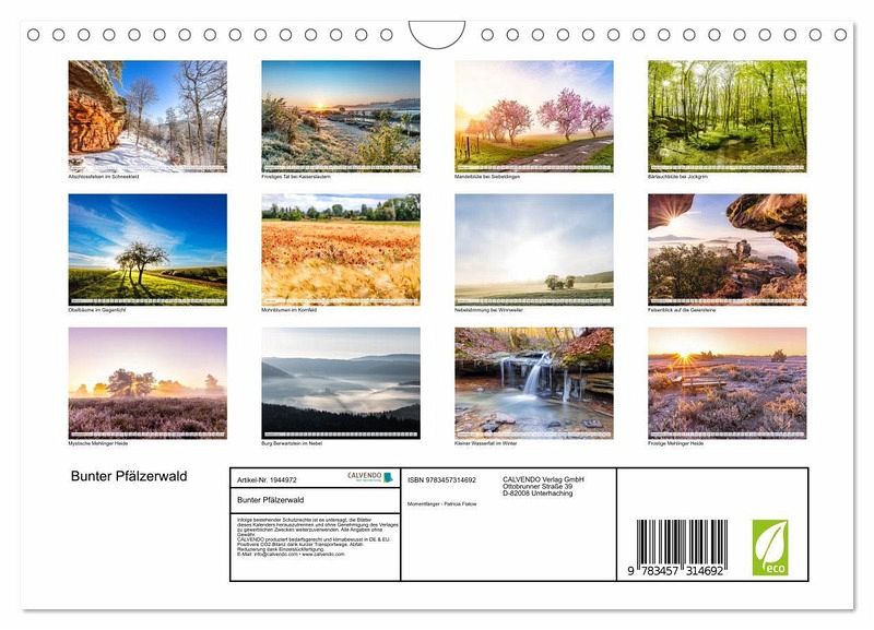QUALITÄT - Hochwertiger Fotokalender mit 12 wunderschönen Motiven auf lichtbeständigem Bilderdruckpapier, robuste Spiralbindung mit Aufhängebügel.NACHHALTIG - deutliche Abfallreduzierung durch bedarfsgerechte Einzelstückfertigung, umweltfreundliches FSC-zertifiziertes Papier, Produktion in Deutschland, klimabewusste Logistik.PERFEKTES GESCHENK - Kalender für Freunde und Familie, für Kinder und Erwachsene, jung und alt, zu Weihnachten, Geburtstag oder zwischendurch.VIELFALT - Bildkalender in verschiedenen Formaten, z.B. DIN A5, DIN A4, DIN A3 sowie DIN A2. Ob Naturmotiv, Gemälde oder Fotos, ideal für ein persönliches Wohlfühlambiente.Entdecke die farbenfrohe Vielfalt des Pfälzerwaldes - Natur pur im Wandel der Jahreszeiten von Autor(in): Momentfänger