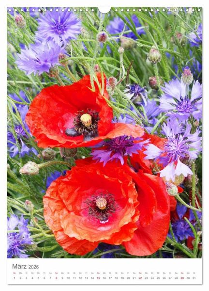 Blüten glänzen im strahlenden Sommerlicht. Freundliche Sonnenblumen, roter Mohn mit blauen Kornblumen, Sonnenhut mit Schmetterlingsbesuch, Dahlien und Rittersporn, sie alle sorgen für ein Jahr voller guter Laune und Sommergefühle.