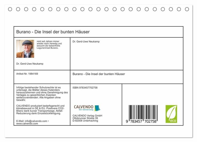 QUALITÄT - Hochwertiger Fotokalender mit 12 wunderschönen Motiven auf lichtbeständigem Bilderdruckpapier, robuste Spiralbindung.NACHHALTIG - deutliche Abfallreduzierung durch bedarfsgerechte Einzelstückfertigung, umweltfreundliches FSC-zertifiziertes Papier, Produktion in Deutschland, klimabewusste Logistik.PERFEKTES GESCHENK - Kalender für Freunde und Familie, für Kinder und Erwachsene, jung und alt, zu Weihnachten, Geburtstag oder zwischendurch.VIELFALT - Bildkalender in verschiedenen Formaten, z.B. DIN A5, DIN A4, DIN A3 sowie DIN A2. Ob Naturmotiv, Gemälde oder Fotos, ideal für ein persönliches Wohlfühlambiente.Die kleine Insel in der Lagune von Venedig in farbenfrohen Bildern von Autor(in): Gerd-Uwe Neukamp
