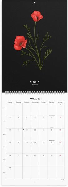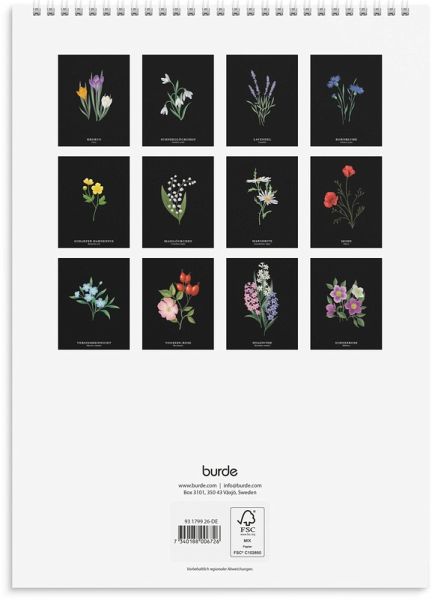 Wandkalender mit Illustrationen aus der Natur. Die wunderschön illustrierten Motive heben sich deutlich vom schwarzen Hintergrund ab und wirken wie ein Gemälde. Im Monatskalendarium gibt es Platz für Notizen. Der Kalender Illustrerad Blomster wurde von Hulda Järeslätt entworfen, einer der Inhouse-Designerinnen bei Burde. Hulda hat Industriedesign an der Universität Lund studiert und sich anschließend auf Grafikdesign und Illustration spezialisiert. "Es ist wichtig, ein wenig Farbe und Form in den Alltag zu bringen, um die Sinne zu inspirieren und zu stimulieren. In meinen Illustrationen arbeite ich gerne mit lebendigen Motiven - rankend und wildwachsend. Dieser Blumenkalender begleitet dich durch das Jahr mit handgemalten Blumen passend zur Jahreszeit." - Hulda Järeslätt Format: A4. Abmessung: 300 x 210 x 8 mm. Layout: Monat/Blatt. Kalendarium: 2026-01-01 - 2026-12-31. Spiralgebunden. Seitenzahl: 12. Umweltinformationen: FSC®.