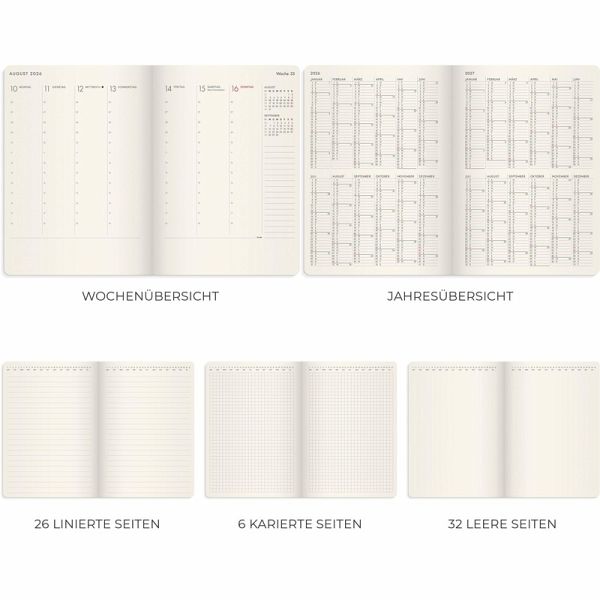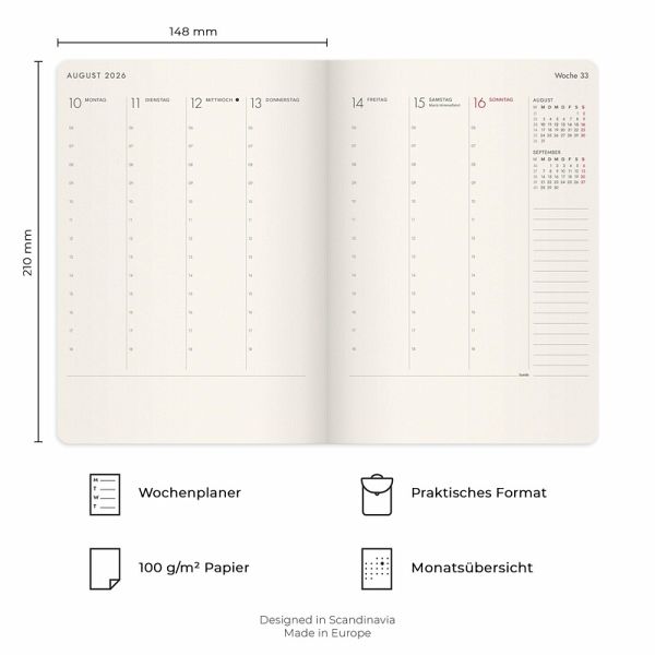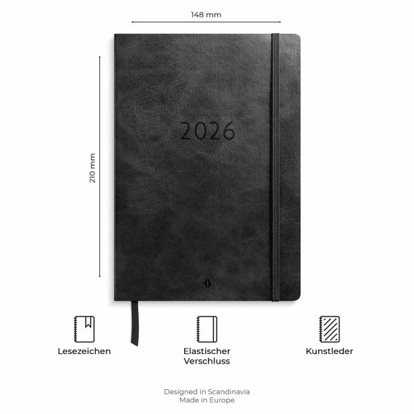 Agency Forma Deluxe ist ein gebundener Kalender mit cremefarbenem Papier, der dank seiner einzigartigen Bindungstechnik flach auf der Tischoberfläche liegt, wenn du schreibst. Der Kalender bietet eine Woche pro Seite, eine vertikale Layout mit Stundenaufteilung von 06-18 und eine Notizfläche am unteren Rand jeder Seite für weiterführende Reflexionen. Zusätzlich enthält der Agency Forma Deluxe eine übersichtliche Jahresplanung sowie weitere Seiten für Notizen. Das schwarzfarbene Kunstleder verleiht dem Kalender eine elegante Ausstrahlung mit Raffinesse. Format: A5. Abmessung: 210 x 150 x 15 mm. Layout: Woche/2-Seiten. Vertikal. Stündliche einteilung 6-18. Kalendarium: 2025-12-22 - 2027-01-03. Einband: Kunstleder. Eingefasst. Einzelheiten: Elastisch. Bandmarker. Papiertasche. Inhalt: Karierte Notizseiten, Linierte Notizseiten, Unlinierte Notizseiten, Jahrespläne. Seitenzahl: 176. Umweltinformationen: FSC®-Papier.